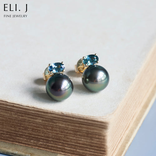 Kaia: Peacock Tahitian Pearl & Teal Sapphire 18K Yellow Gold Earrings
