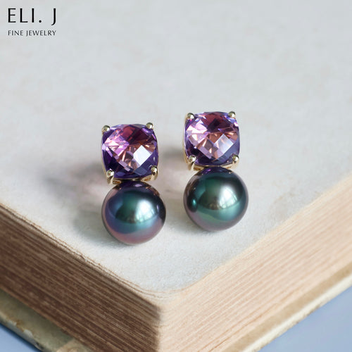 Iris: Rare Purple Tahitian Pearl & Amethyst 18K Yellow Gold Earrings