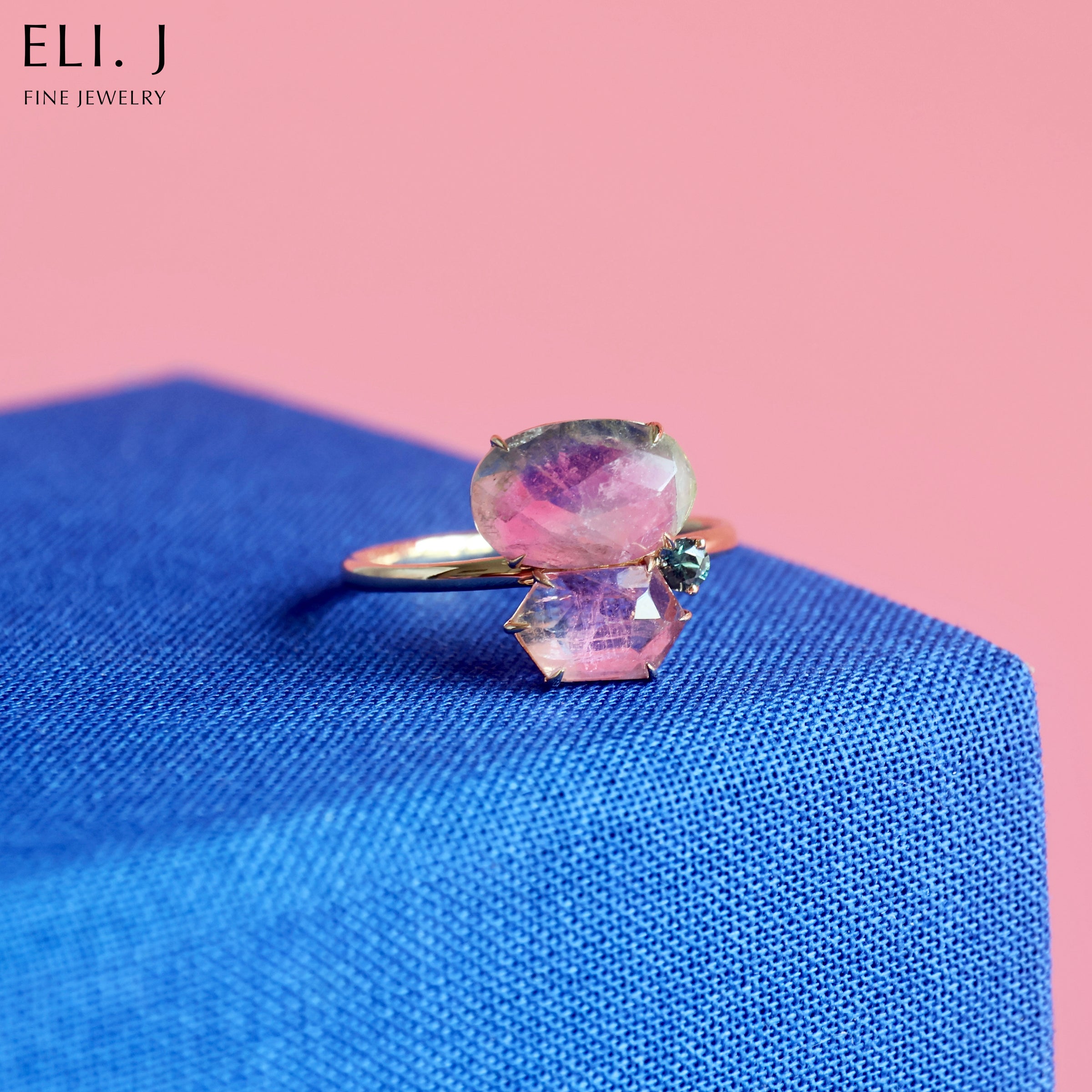 Oval and hexagon watermelon tourmaline shapes pair together for a beautiful spread on your fingers. We added a little teal spinel there for a pop of colour.